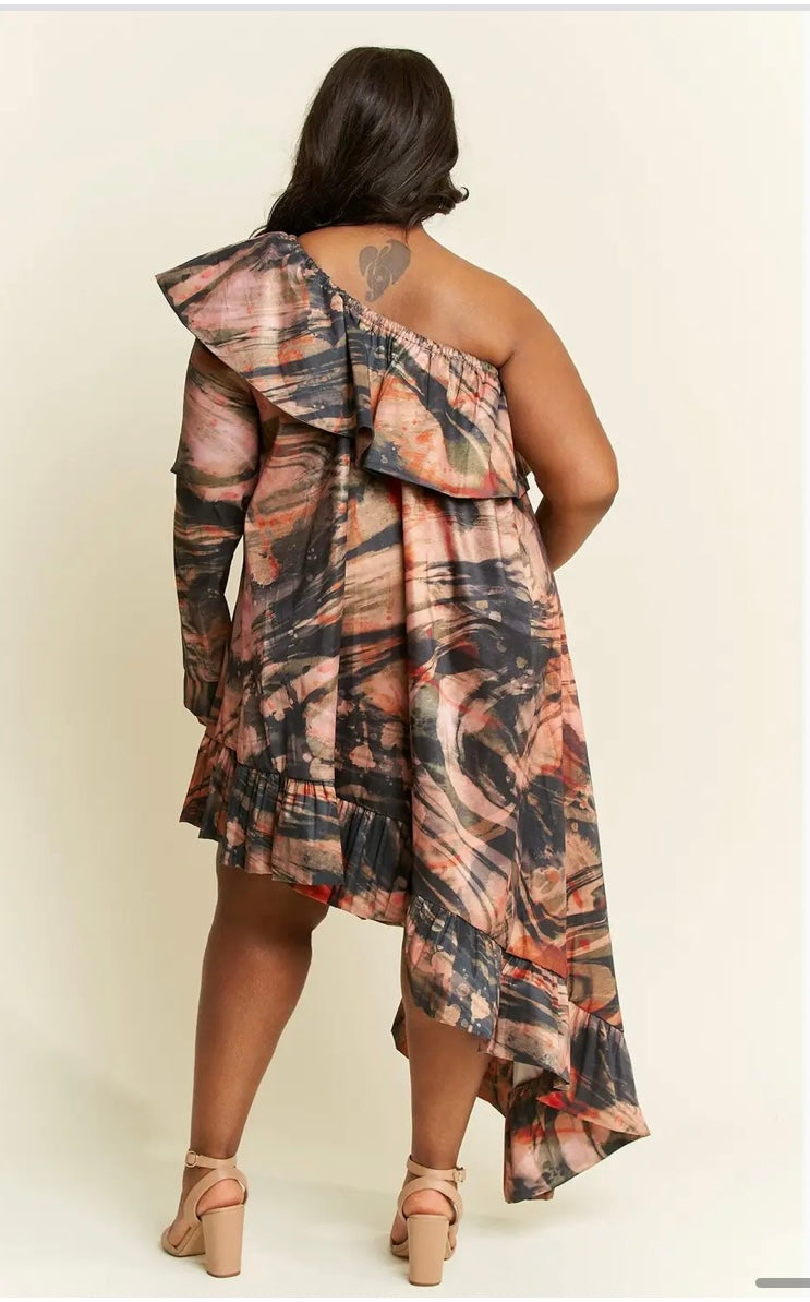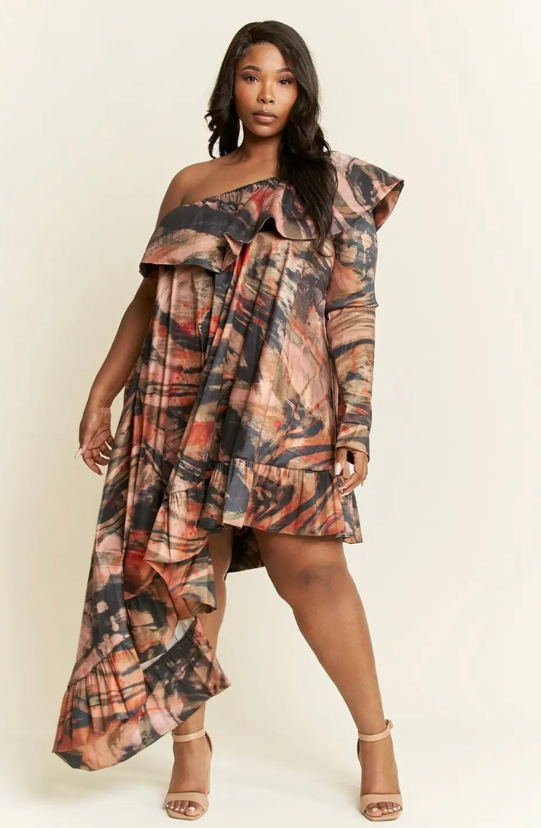 A symmetrical earthtone dress